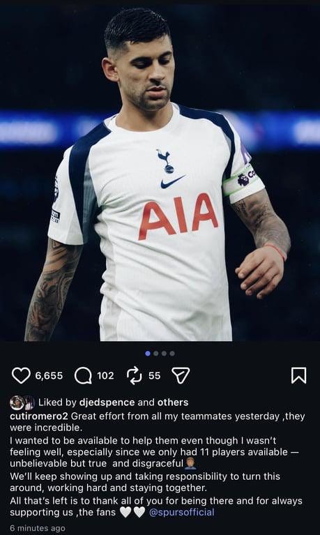Wait, it gets better: Thomas Frank had to take Christian Romero—not just our best center back but, it sometmes seems, our best scoring threat—off the pitch due to illness, leaving our back line anchored down by the likes of Radu Dragusin and Archie Gray, the type of ER-shift defense that cost Ange Postecoglou his job. Rayan Cherki looked as if he was going to take away MOTM honors as he scored the opener and was generally having his way with our back line.