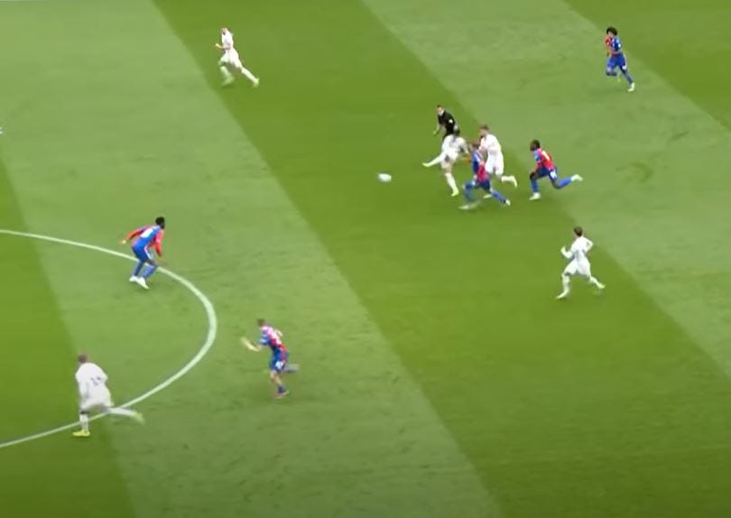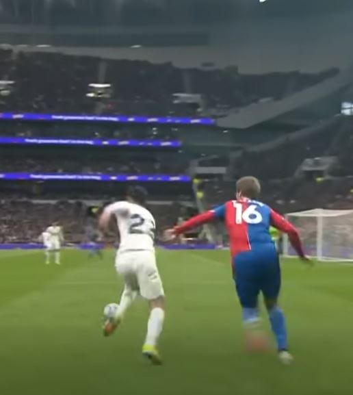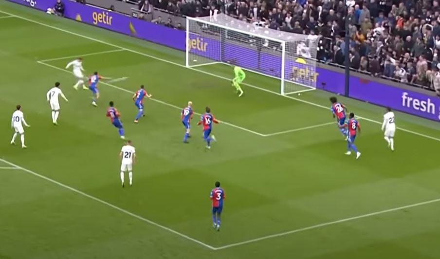 We did have a golden chance when Rodrigo Bentancur dispossessed Eberechi Eze and Son Heung-min executed a 3-D chess pass that sent Timo Werner 1 v 1 against Palace keeper Sam Johnstone. So far, Timo has been as advertised—a pacey, energetic winger in the mold of Aaron Lennon who gets himself in good positions, yet who lacks composure in front of goal (and that may be unfair to Azza). Timo hasn’t exactly exuded confidence on his chances, and it was no surprise that Johnstone emerged the winner on this one.