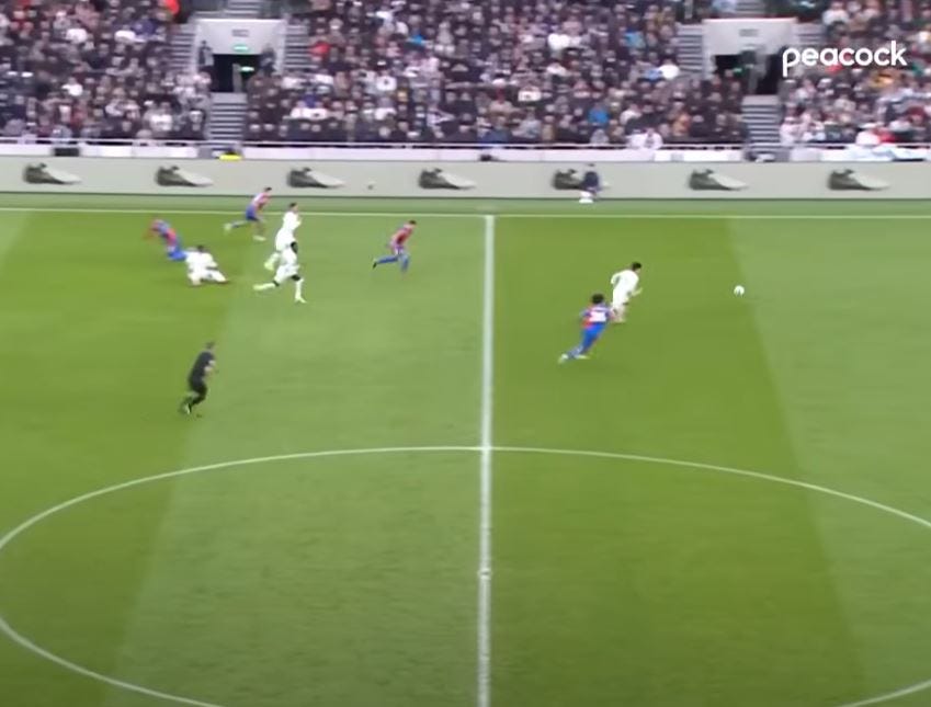 Let us now pause to praise our center half partnership of Romero and Mickey van de Ven. The former scored the go-ahead goal, and the latter initiated the sequence that iced the game. vdV, recently timed to be the fastest player in Premier League history, stepped up the stop a Palace attack, strode forward, and found Destiny Udogie at midfield. Johnson collected a loose ball and set Son away on a 1 v 1. With apologies to Timo, who played a good game—and showed why we should exercise our very affordable option to sign him permanently this summer—seeing Son on a breakaway is an entirely different experience. As soon as he got a step on his man, you knew our xG-exceeding captain would score, and score he did.